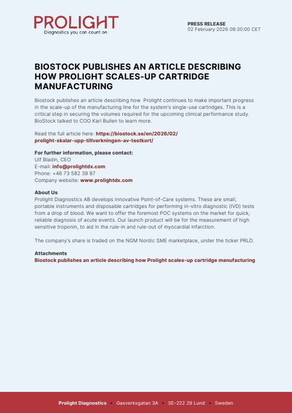 Biostock publishes an article describing how Prolight continues to make important progress in the scale-up of the manufacturing line for the system’s single-use cartridges. This is a critical step in securing the volumes required for the upcoming clinical performance study. BioStock talked to COO Karl Bullen to learn more.