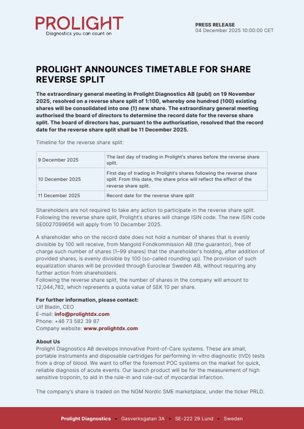 The extraordinary general meeting in Prolight Diagnostics AB (publ) on 19 November 2025, resolved on a reverse share split of 1:100, whereby one hundred (100) existing shares will be consolidated into one (1) new share. The extraordinary general meeting authorised the board of directors to determine the record date for the reverse share split. The board of directors has, pursuant to the authorisation, resolved that the record date for the reverse share split shall be 11 December 2025.