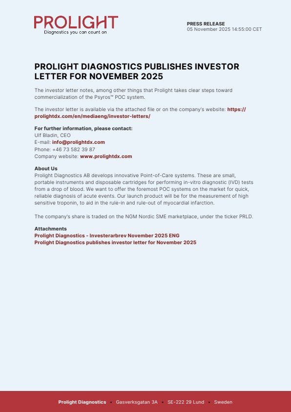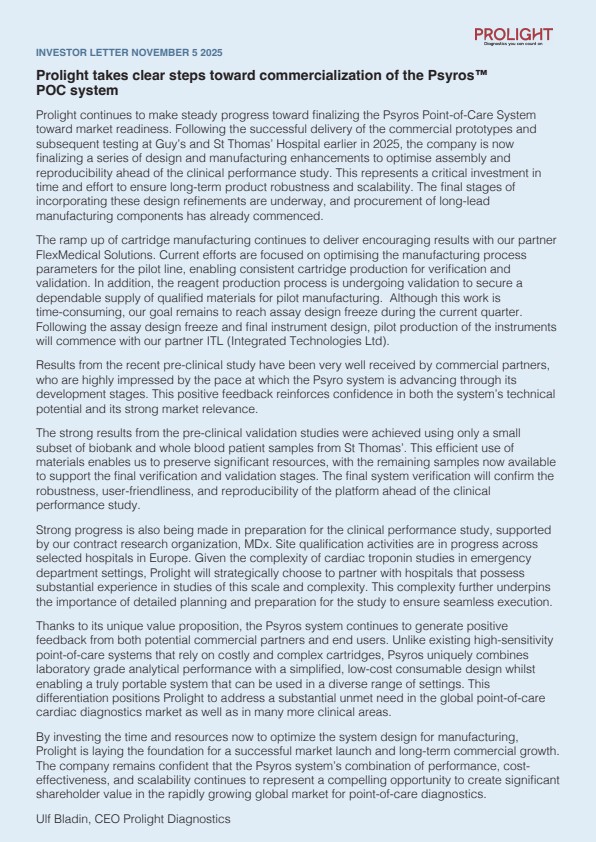 The investor letter notes, among other things that Prolight takes clear steps toward commercialization of the Psyros™ POC system.