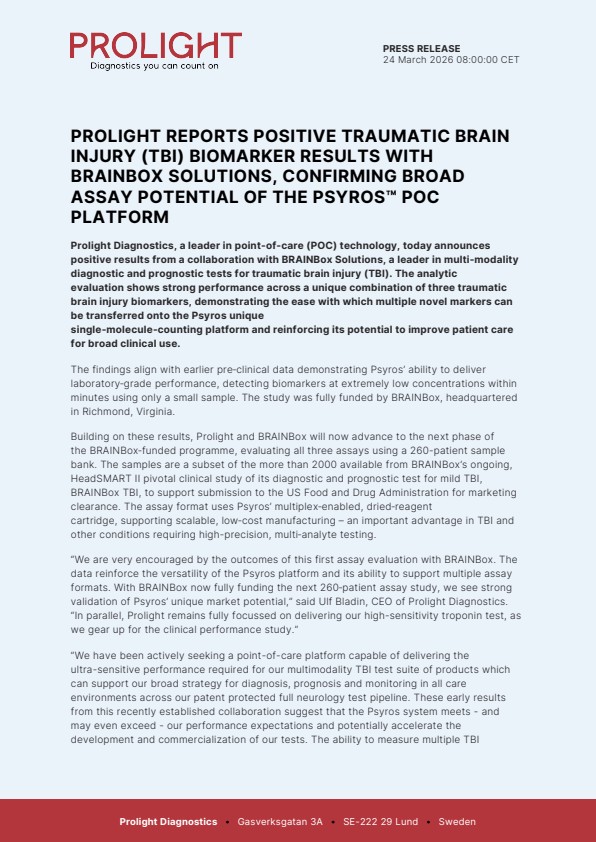 “We are very encouraged by the outcomes of this first assay evaluation with BRAINBox. The data reinforce the versatility of the Psyros platform and its ability to support multiple assay formats. With BRAINBox now fully funding the next 260‑patient assay study, we see strong validation of Psyros’ unique market potential,” said Ulf Bladin, CEO of Prolight Diagnostics. “In parallel, Prolight remains fully focussed on delivering our high-sensitivity troponin test, as we gear up for the clinical performance study.”