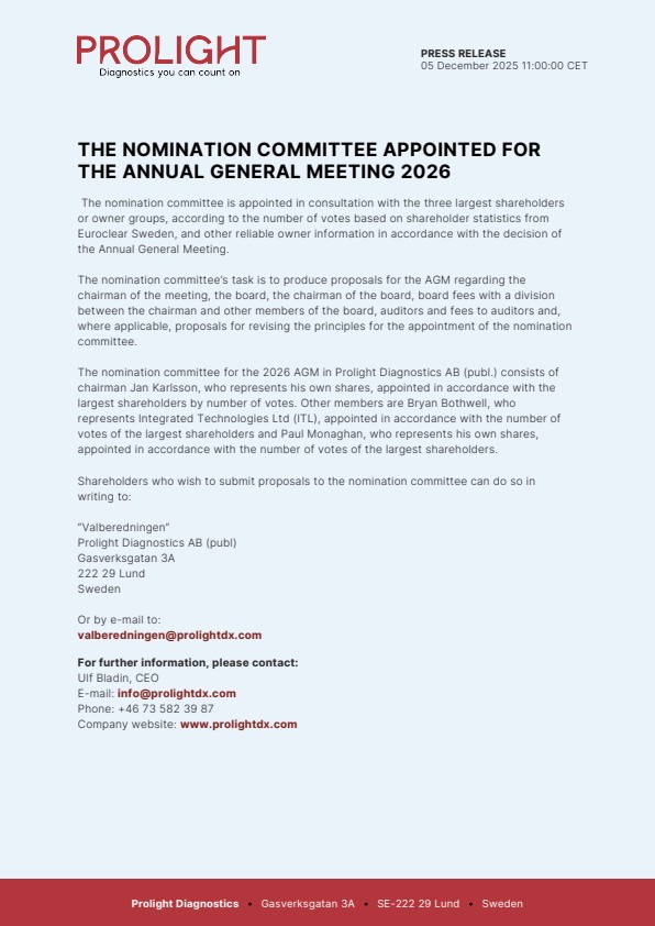 The nomination committee for the 2026 AGM in Prolight Diagnostics AB (publ.) consists of chairman Jan Karlsson, who represents his own shares, appointed in accordance with the largest shareholders by number of votes. Other members are Bryan Bothwell, who represents Integrated Technologies Ltd (ITL), appointed in accordance with the number of votes of the largest shareholders and Paul Monaghan, who represents his own shares, appointed in accordance with the number of votes of the largest shareholders.
