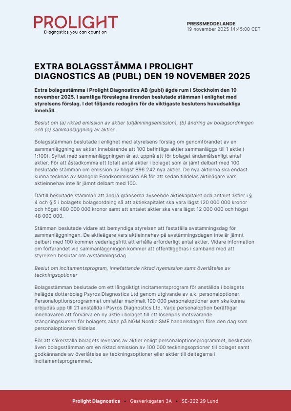 Extra bolagsstämma i Prolight Diagnostics AB (publ) ägde rum i Stockholm den 19 november 2025. I samtliga föreslagna ärenden beslutade stämman i enlighet med styrelsens förslag. I det följande redogörs för de viktigaste beslutens huvudsakliga innehåll.