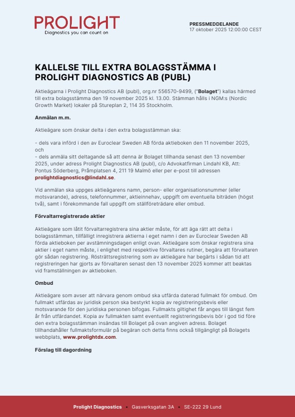 Aktieägarna i Prolight Diagnostics AB (publ), org.nr 556570-9499, (”Bolaget”) kallas härmed till extra bolagsstämma den 19 november 2025 kl. 13.00. Stämman hålls i NGM:s (Nordic Growth Market) lokaler på Stureplan 2, 114 35 Stockholm.