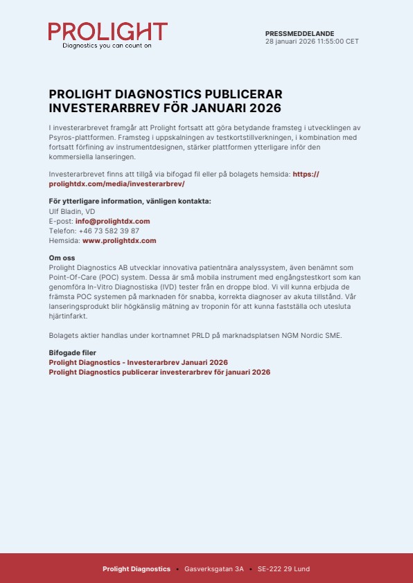 Investerarbrevet finns att tillgå via bifogad fil eller på bolagets hemsida: https://prolightdx.com/media/investerarbrev/