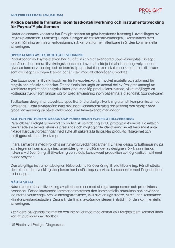 I investerarbrevet framgår att Prolight fortsatt att göra betydande framsteg i utvecklingen av Psyros-plattformen. Framsteg i uppskalningen av testkortstillverkningen, i kombination med fortsatt förfining av instrumentdesignen, stärker plattformen ytterligare inför den kommersiella lanseringen.