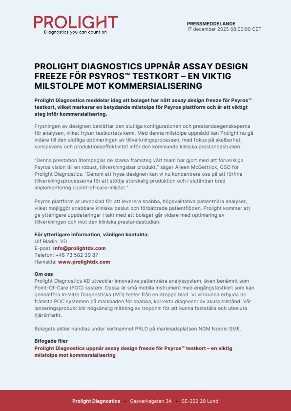 Psyros plattform är utvecklad för att leverera snabba, högkvalitativa patientnära analyser, vilket möjliggör snabbare kliniska beslut och förbättrade patientflöden. Prolight kommer att ge ytterligare uppdateringar i takt med att bolaget går vidare med optimering av tillverkningen och mot den kliniska prestandastudien.