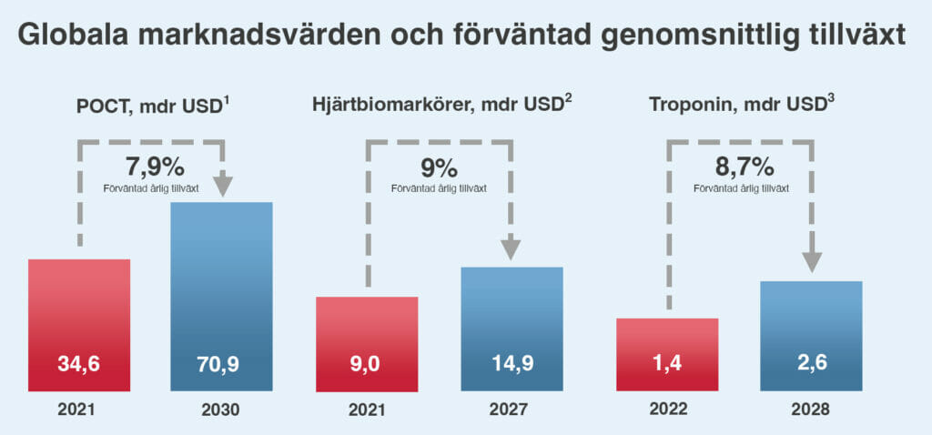 Vad gäller POC-testning för hjärtbiomarkörer är uppfattningen den att marknaden drivs av en ökning av antalet hjärtsjuka på global basis och en ökad medvetenhet kring behoven av tidig diagnos för att kunna ge patienter snabba och relevanta vårdinsatser.